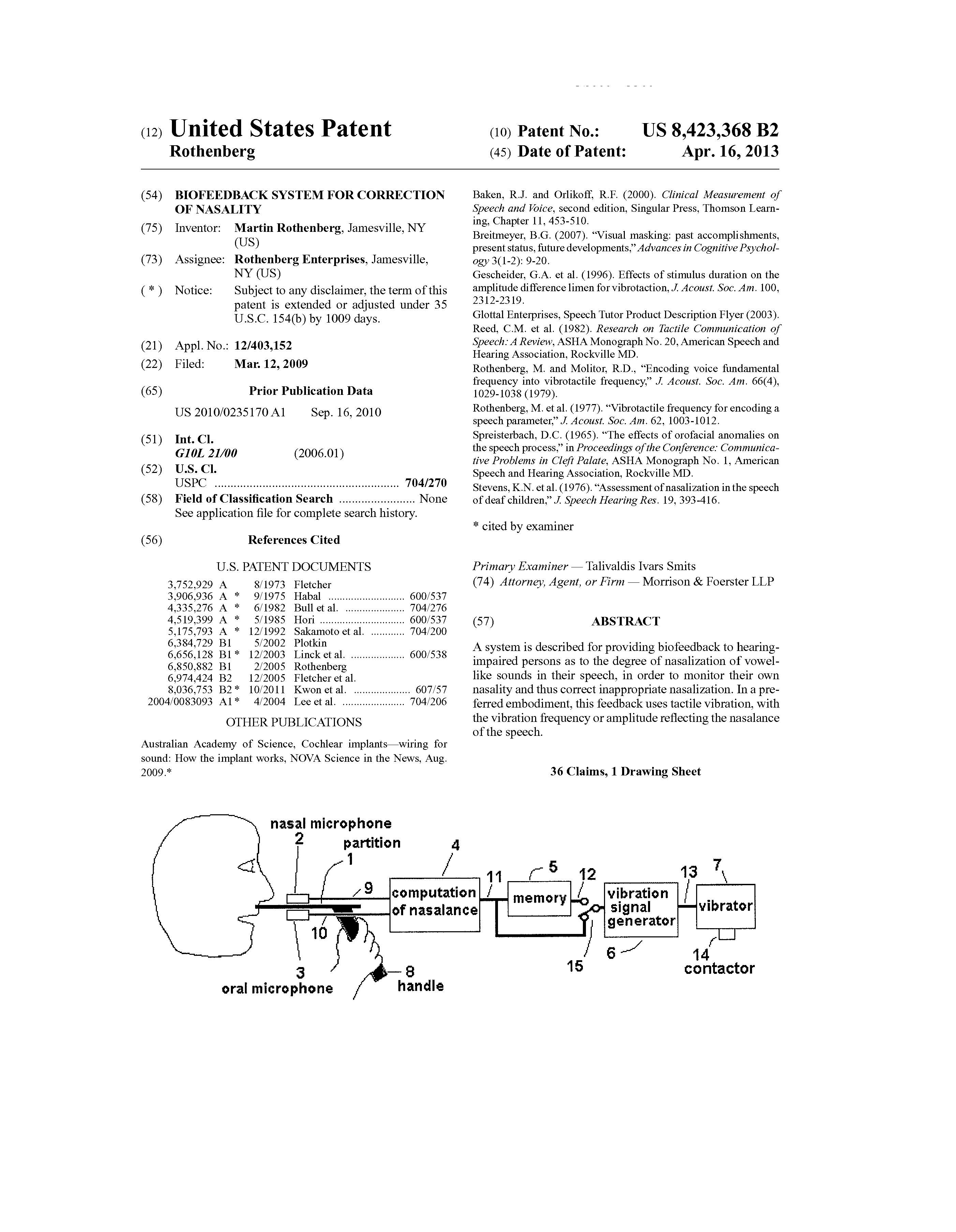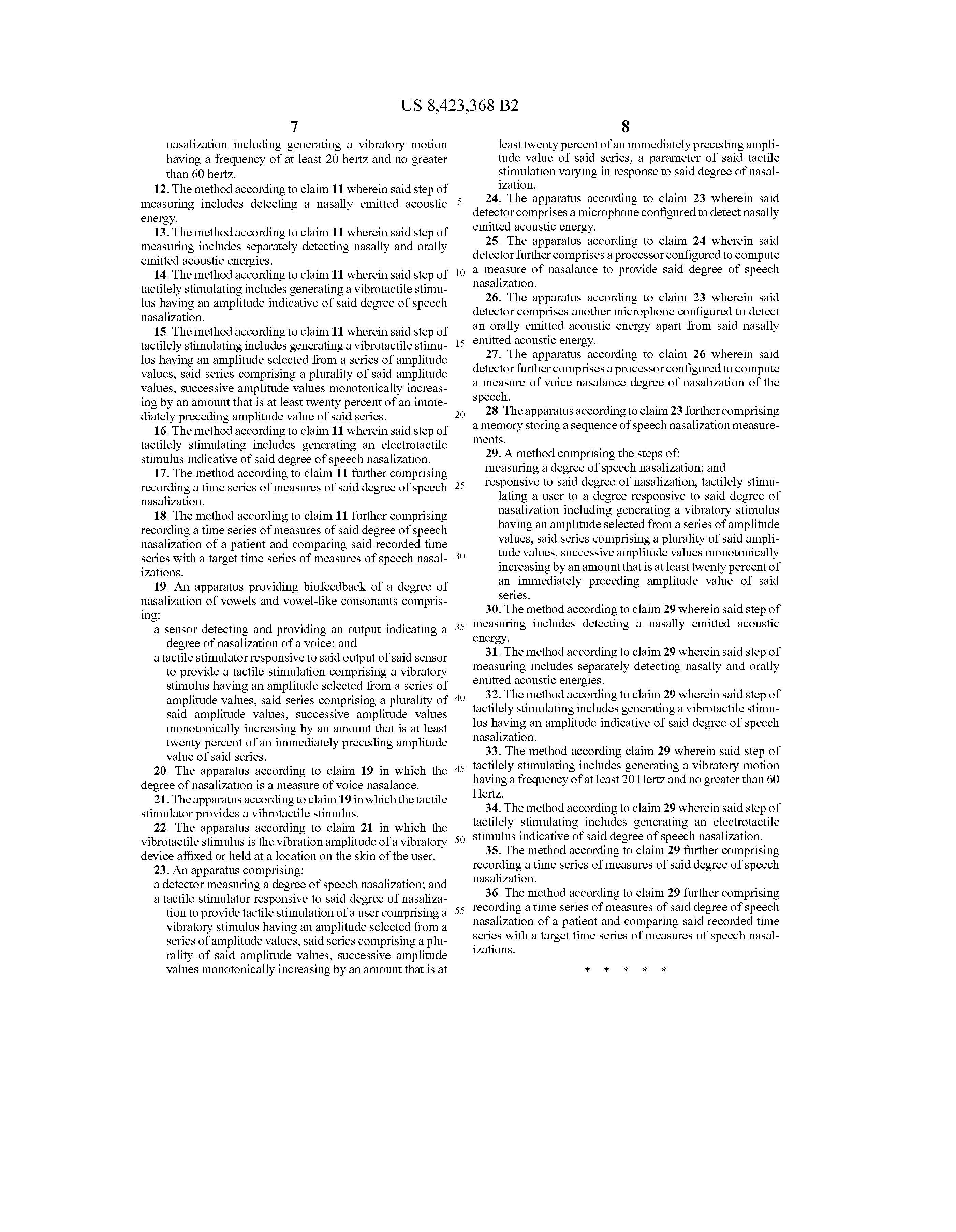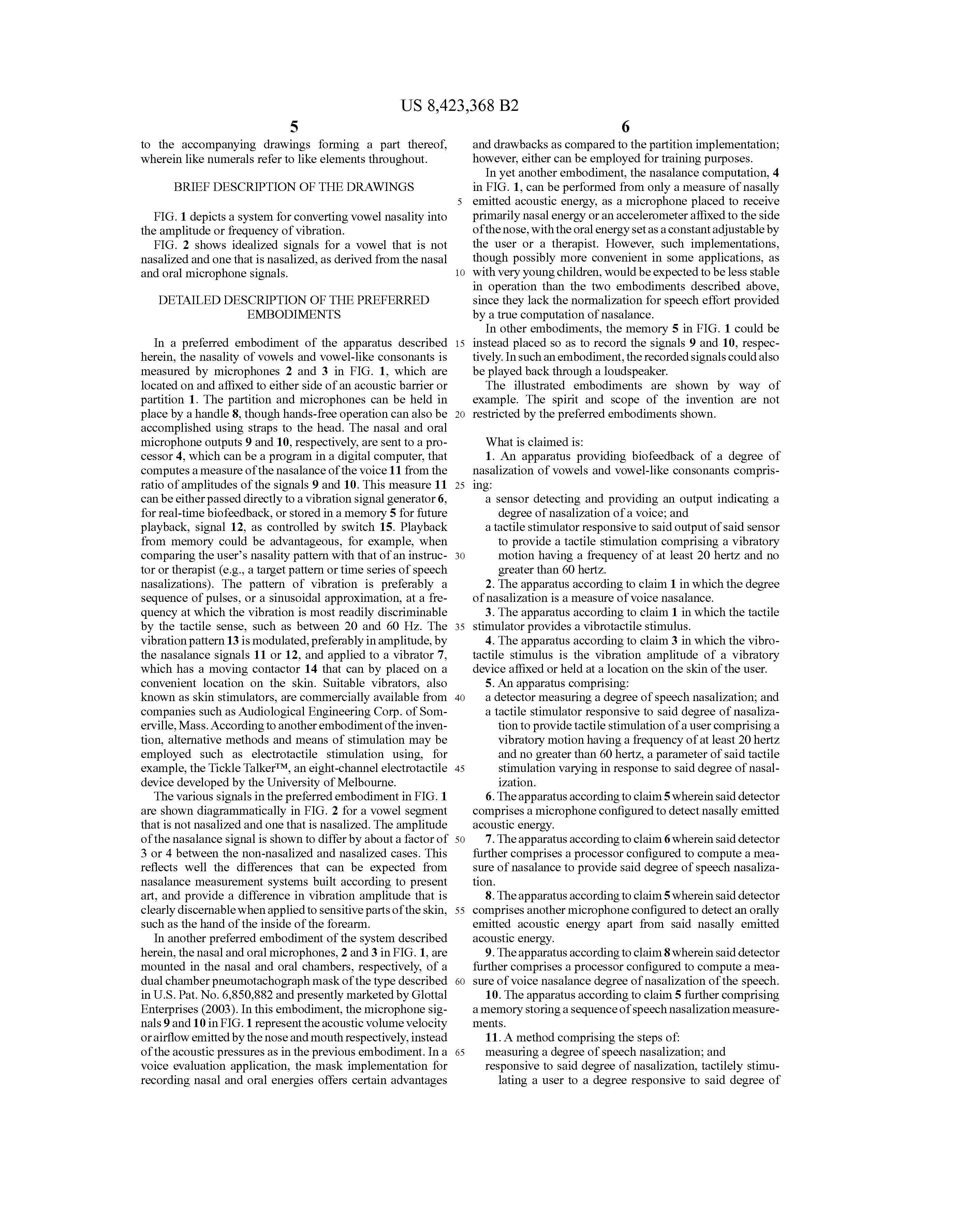 A system is described for providing biofeedback to hearing-impaired persons as to the degree of nasalization of vowel-like sounds in their speech, in order to monitor their own nasality and thus correct inappropriate nasalization. In a pre-ferred embodiment, this feedback uses tactile vibration, with the vibration frequency or amplitude reflecting the nasalance of the speech.