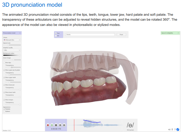 该动画三维发音模型由唇、牙、舌、下颌、硬腭和软腭组成。这些咬合器的透明度可以调整以揭示隐藏的结构,并且模型可以旋转360°。模型的外观也可以在真实感或风格化模式下查看。