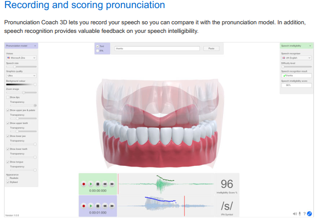 发音教练3D让您记录您的讲话,以便您可以比较它与发音模型。此外,语音识别为您的语音清晰度提供了宝贵的反馈。