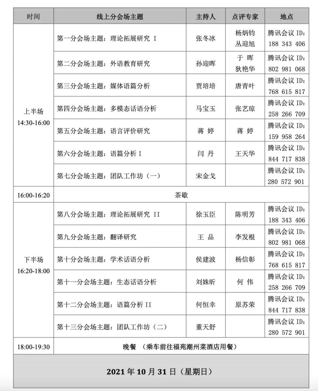 10月29日10:30-22:30在临江酒店前堂报到,10月30日和10月31日上午大会开幕式、大会主旨发言及大会发言的地点设在韩师伟南国际会议中心,10月30日下午线下分会场小组发言的地点设在韩师外院伟南楼,线上发言均使用腾讯会议系统。