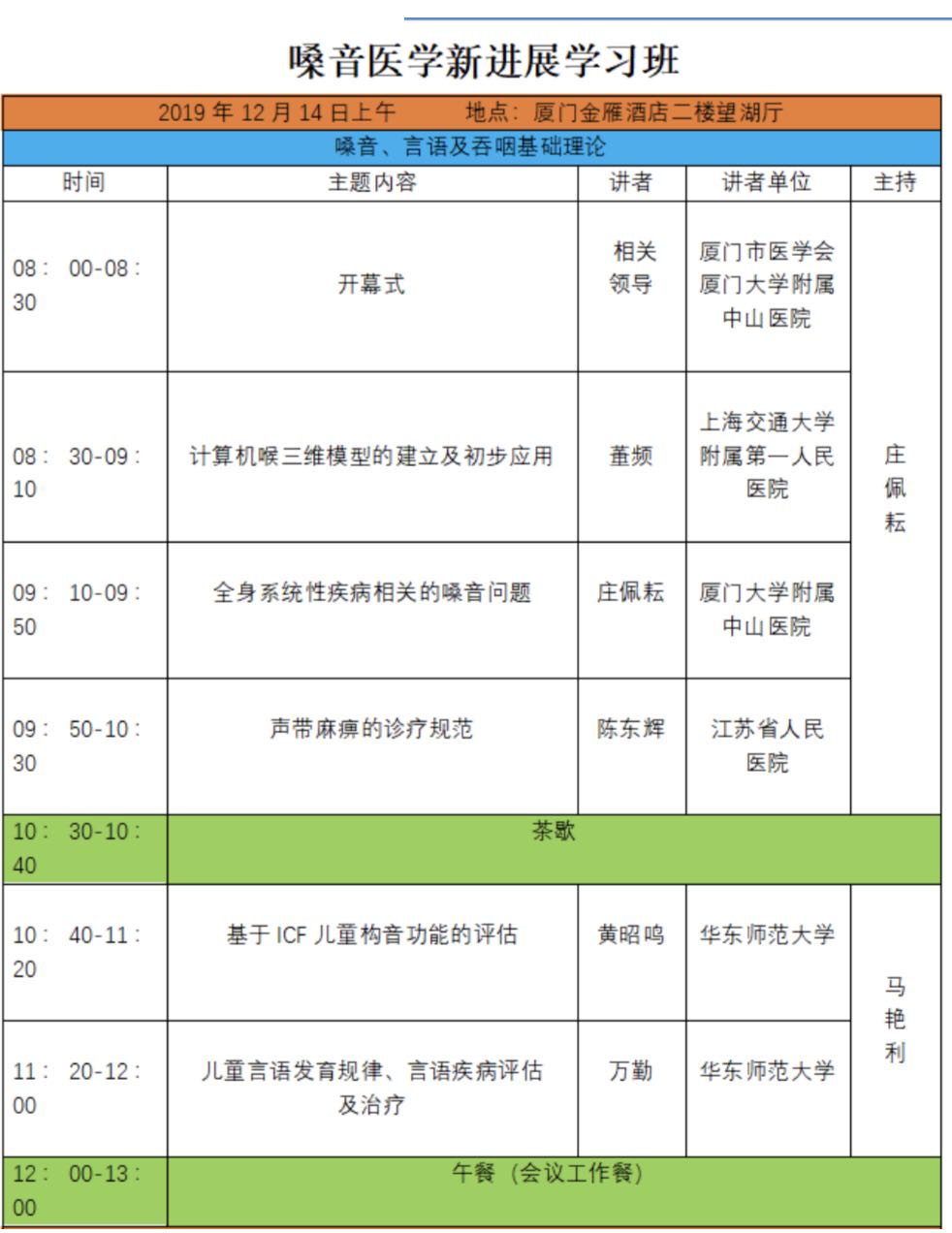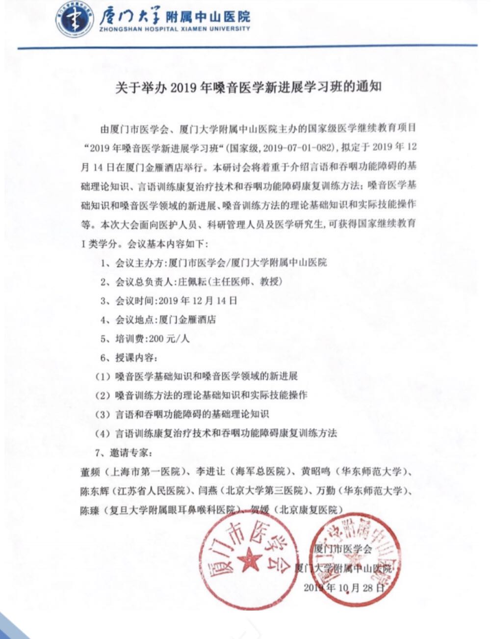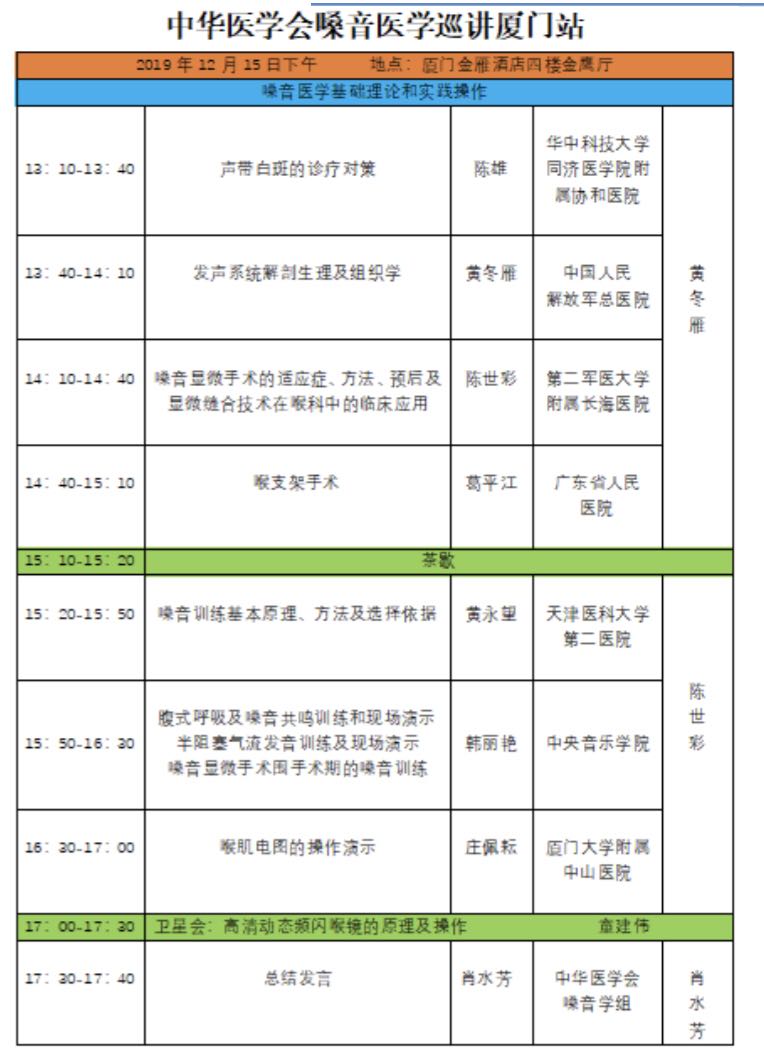 2019年嗓音医学新进展学习班暨中华医学会嗓音医学巡讲厦门站会议包含两部分,嗓音医学新进展学习班拟定于2019年12月14日举行, 中华医学会嗓音医学巡讲厦门站定于2019年12月15日举行。嗓音医学新进展学习班着重于介绍言语和吞咽功能障碍的基础理论知识、言语训练康复治疗技术和吞咽功能障碍康复训练方法;中华医学会嗓音医学巡讲则着重于嗓音医学基础知识和嗓音医学领域的新进展、嗓音训练方法的理论基础知识和实际技能操作等。