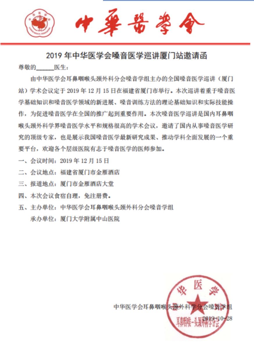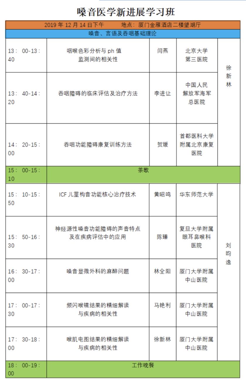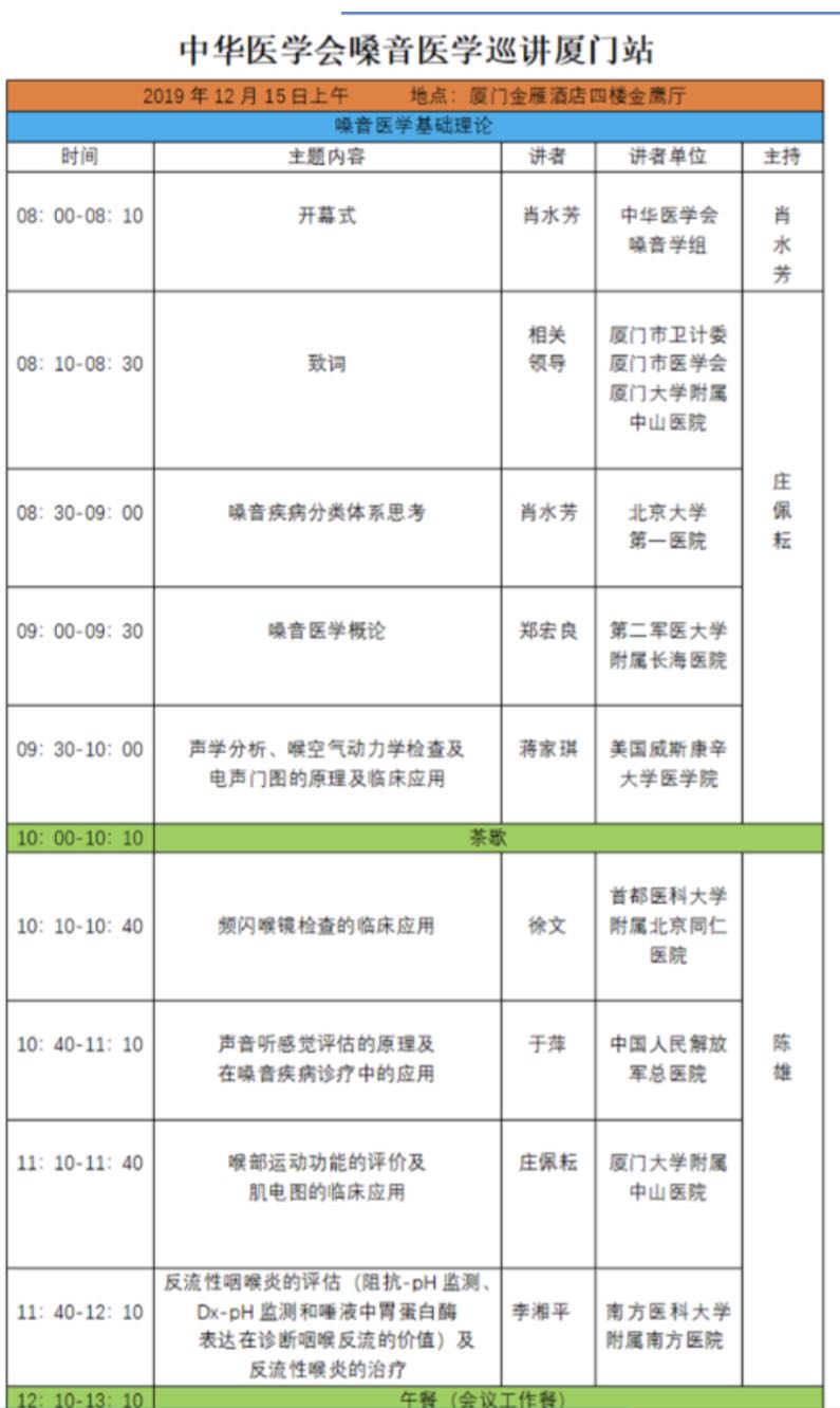 2019年嗓音医学新进展学习班暨中华医学会嗓音医学巡讲厦门站会议包含两部分,嗓音医学新进展学习班拟定于2019年12月14日举行, 中华医学会嗓音医学巡讲厦门站定于2019年12月15日举行。嗓音医学新进展学习班着重于介绍言语和吞咽功能障碍的基础理论知识、言语训练康复治疗技术和吞咽功能障碍康复训练方法;中华医学会嗓音医学巡讲则着重于嗓音医学基础知识和嗓音医学领域的新进展、嗓音训练方法的理论基础知识和实际技能操作等。