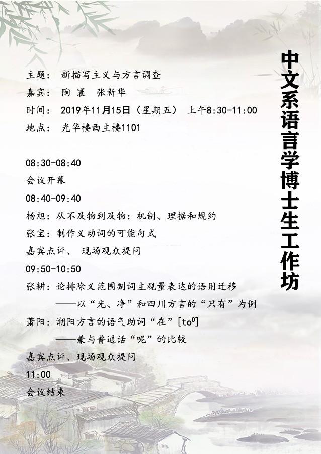 本次工作坊以“新描写主义与方言调查”为主题,旨在鼓励运用新描写主义的取向进行研究,加强保护方言的意识。工作坊邀请了四位发言人进行报告。报告或聚焦于微观问题,或进行跨方言比较,或进行细致描写,或使用跨学科方法,对普通话或方言中的一些具体问题进行了详尽的探讨。
