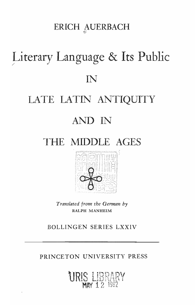 Erich Auerbach, Literary Language & Its Public in Late Latin Antiquity and in the Middle Ages