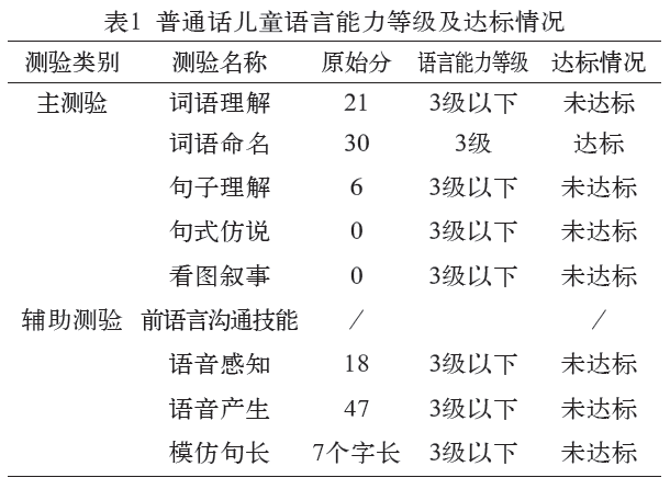 由表1可知,该儿童5项主测验中,词语命名达标;词语理解、句子理解、句式仿说、看图叙事4项未达标;4项辅助测验中,前语言沟通技能通过,语音感知、语音产生、模仿句长3项未达标。整体来看,该儿童有一定的语言能力,具备基本的语言沟通技能,语言理解能力中句子理解能力较好,但词语理解欠佳,被动语言表达能力(如复述、模仿)及主动语言表达能力均较弱。