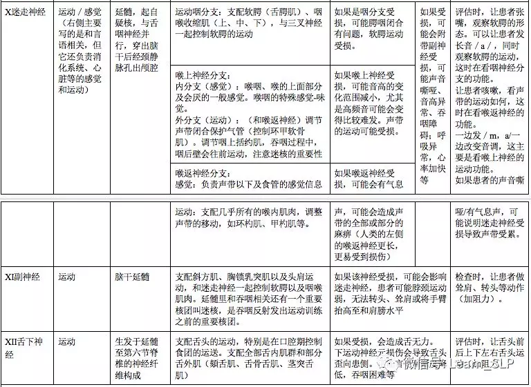 上面的表格基本上就是和言语吞咽相关的脑神经的介绍了(注意吞咽不包括第八对脑神经),包括了它们的功能,受损后的情况及初步的评估。可能有的小伙伴在想为什么它们会受损呢?或者说被压迫呢?这里面也有很多原因,比如针对神经本身,手术的时候不小心切到了喉返神经,或者面神经瘤压迫了面神经,或者源头脑干梗塞/出血,再或者源头出现在上面,脑干没有办法向下传递信息。这些都有可能出现表格中左数第二列的损伤情况,当然具体问题需要具体分析,病人的病史可以提供很多信息。语言治疗师需要了解最右边一栏检查和言语、吞咽相关的脑神经的基本方法,这也是在评估成年病人的言语构音障碍dysarthria的一个评估小项。可能有的小伙伴看评估方法时会冒嘀咕,这不就是我平时做的一些内容吗,那你现在知道背后这样做的原因了吗?