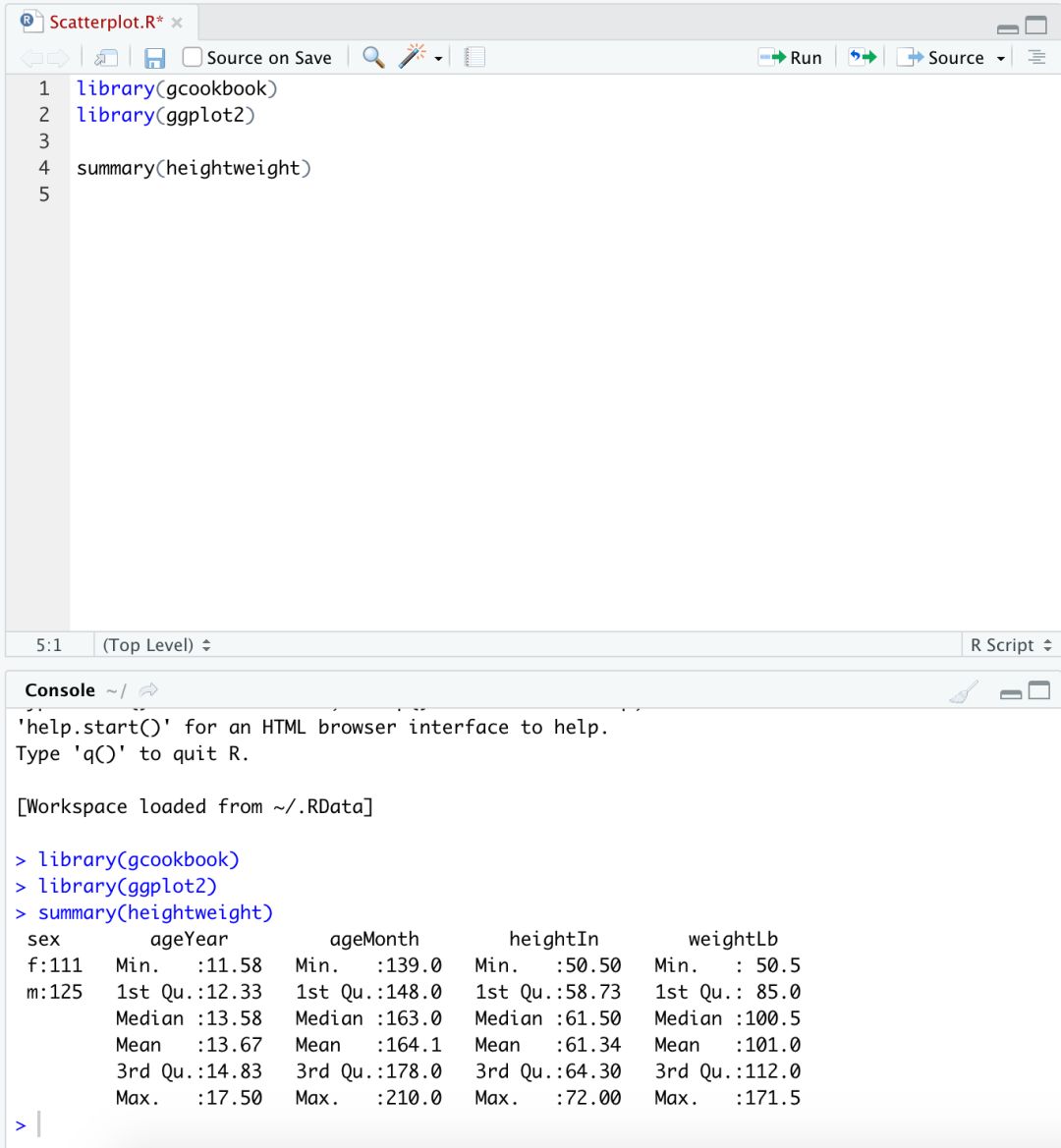 对于散点图我们并不陌生,在Excel中我们也经常看到它的身影。在上一篇可视化初阶的文章中,我们看到使用geom_point( )函数就可以指定成为散点图了。为了方便起见,我们使用gcookbook包中的数据来做一次最基本的散点图。如果没有安装过这个包,请记得使用intall.packages( )函数安装,然后使用library( )函数加载gcookbook和ggplot2两个包。下面我们要画的是heightweight中的数据。为了方便操作,我们可以使用summary( )函数先看看这个数据里都有什么内容。可以看到里面有这样几项:性别、年、月、身高、体重。我们先以ageYear和heightIn为例画散点图。