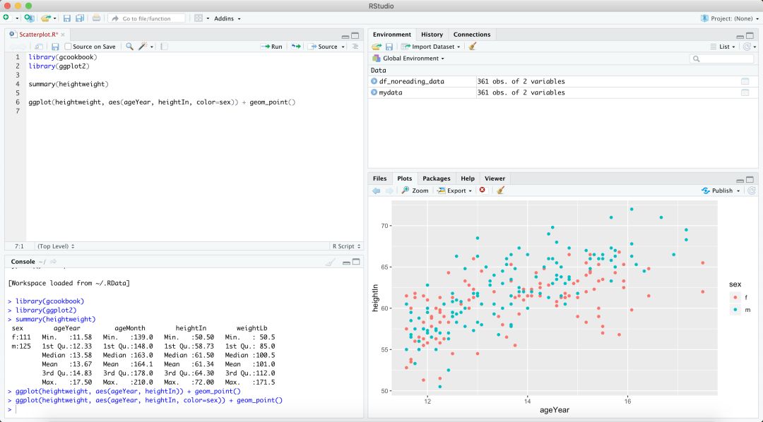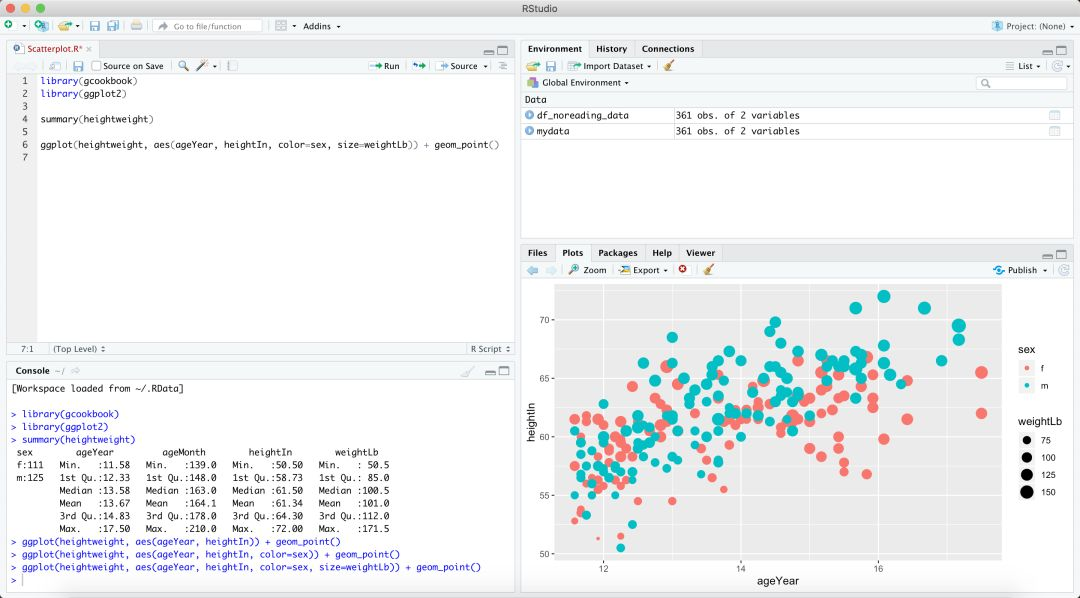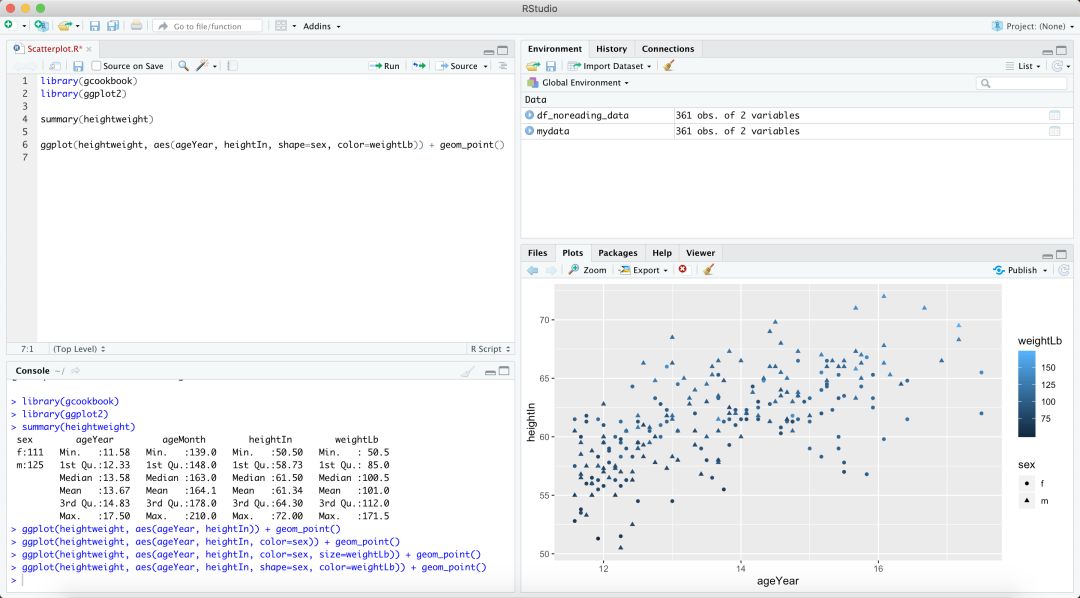这时候有的人就会想法更大了:你看这个heightweight数据中,既然有身高和体重,如果我想有性别分组的时候,还加入体重,该怎么办呢?其实很简单,我们回顾一下ggplot( )函数中我们可以选择的图形对象,有线条、大小、形状等等,我们不妨使用size来实验一下,可以看到,横坐标是ageYear,纵坐标是heightIn,我们以颜色区分了性别,大小区分了体重。
