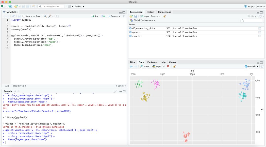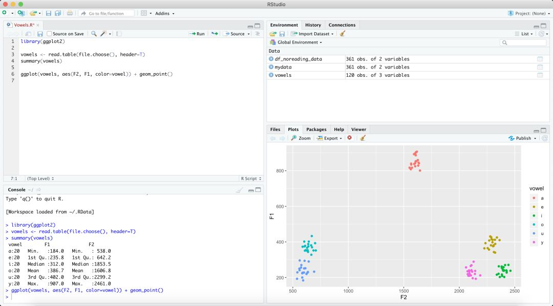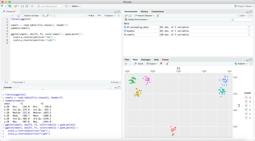 首先,我们先“搞到”一些元音的共振峰数据,此处我们使用了六个元音的F1和F2数值,一共有三列数据:元音、F1、F2。在载入数据前,务必记得载入ggplot2包,这样我们才能使用ggplot( )函数。