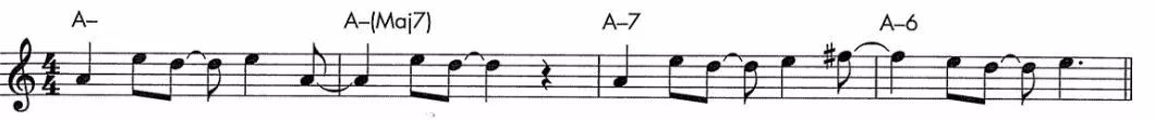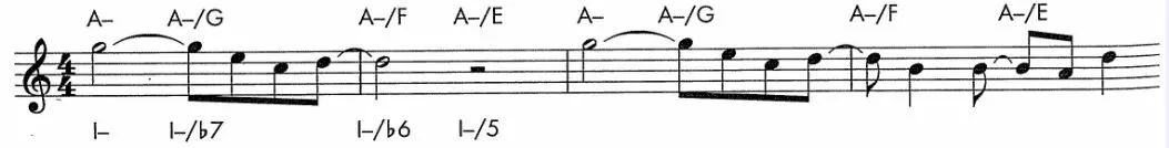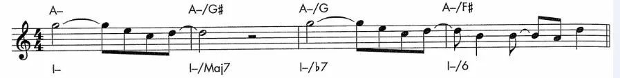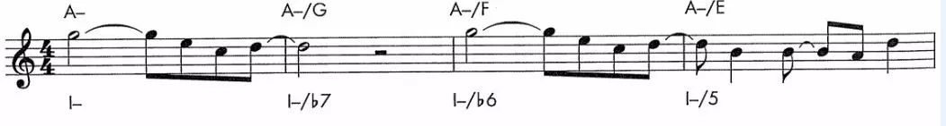 为了将Line Cliches作为一种重配和弦的技巧,就要找到大多数音都要在同一个调内的旋律,并且最好旋律会有重复的部分。例如下面的例子,旋律音都处于a小调之中,旋律进行了一次重复后发展出来。然后,移除本来的和声进行,根据旋律音与调性加入一个大三和弦或小三和弦。