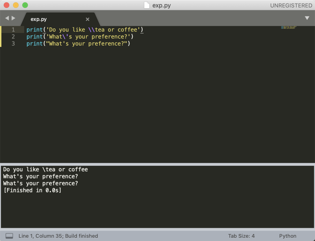 再比如,我想输出What's your preference?这一句,根据字符串要求,我需要放在引号中。但是计算机语言它是一个“线性读取”,在读到's的时候,会识别这里已经有单引号了,因此它会认为到这里是字符串的末尾。结果读到最后又出来一个单引号,并且没有与之配对的,因此会报错。这时候我们在单引号前输入转义字符,就是告诉程序,这个不是你所知道的那个单引号功能。当然,这种情况下你也可以使用双引号来实现字符输出。
