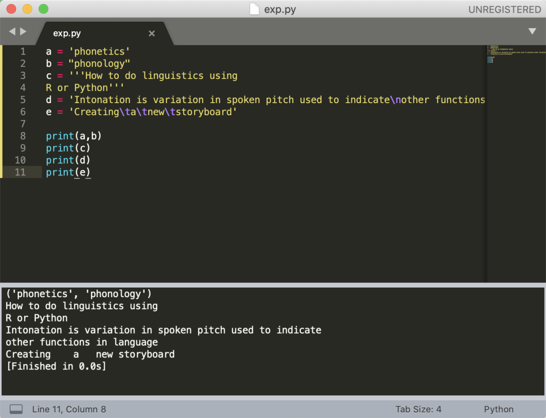 第三,字符型(string),即所有的文字、语句等等,也可以把其他类型的数据转换为字符型。对于语言学研究者来说,这可能是接触到最多的数据类型。字符型数据使用一对单引号'text'或一对双引号"text",当使用三对单引号或双引号时,Python允许你换行输入。当然,你也可以使用单引号并在里面设置换行符\n实现分行。除了换行,还有\t用来表示缩进,也就是键盘上的tab键(一般是四个空格),实现的是表达一个制表符。