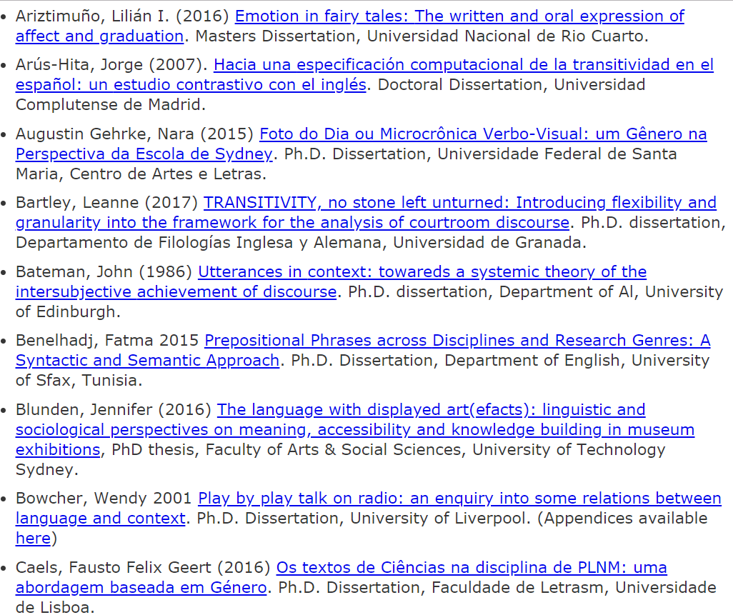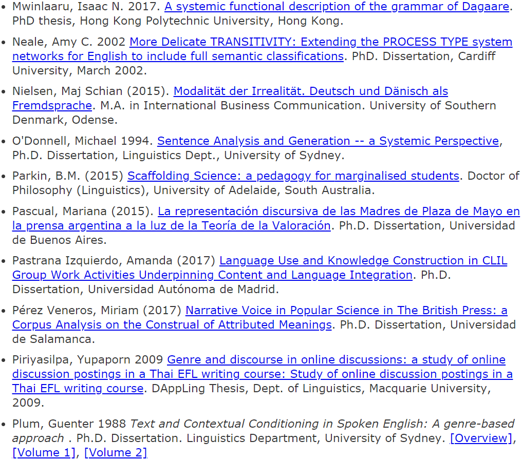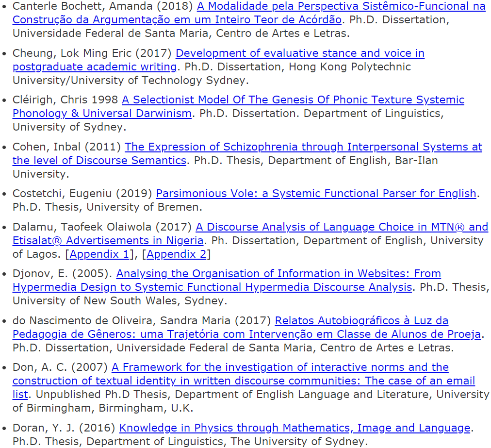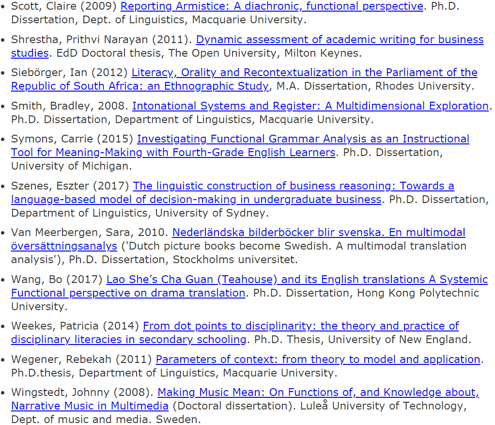 此条推送是关于SFL博士论文的不完全集锦帖。此列表中的论文主要来源于国外和我国香港特别行政区的所属高校。我们也欢迎各位老师同学们继续补充!希望越来越多学习系统功能语言学的小伙伴都可以像列表中出现的各位研究SFL的前辈们一样,“榜上有名”~~