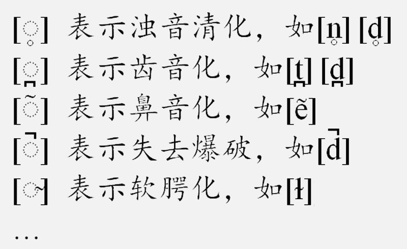 在国际音标表中,除了用字母来描述语音之外,还会使用特定的符号来使语音描述更为精准。在视频中我们提到用音标描写送气音的时候,使用[ ʰ],例如[tʰ] [dʰ]。其余常见的音标符号还有: