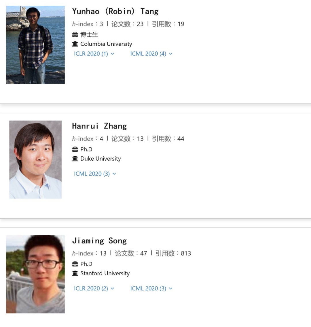 华人学生在本次的会议表现同样亮眼,有第一作者身份的华人学生在本次会议上发表两篇论文及以上的有 15 人,其中来自哥伦比亚大学的博士生 Yunhao (Robin) Tang 有 4 篇文章入选,位居华人一作学生贡献榜第一,且在 4 篇入选论文中,他有两篇是第一作者。发表了 3 篇论文的博士生 Hanrui Zhang 和 Jiaming Song 分别来自杜克大学与斯坦福大学,他们都仅有一篇论文作为第一作者。