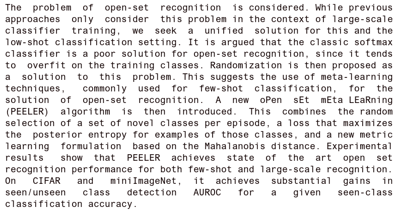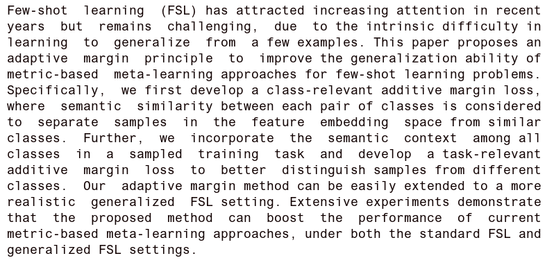 - 近年来,少次学习(Few-Shot learning,FSL)吸引了越来越多的关注,但由于的确很难从几个样例里进行概括,因而该任务仍具有挑战。[25]提出一种自适应边际原理(adaptive margin principle),以提高基于度量的元学习方法对少次学习问题的泛化能力。具体而言,首先研发与类相关的加法边际损失,其中考虑每对类之间的语义相似性以将特征嵌入空间中的样本与相似类分开。其次,将语义上下文纳入样本训练任务中的所有类别间,并开发与任务相关的额外边际损失(additive margin loss),以更好区分不同类的样本。所提方法可以轻松扩展到更现实的广义FSL场景中。大量实验表明,该方法在标准FSL和广义FSL设置下均可提高当前基于度量的元学习方法的性能。