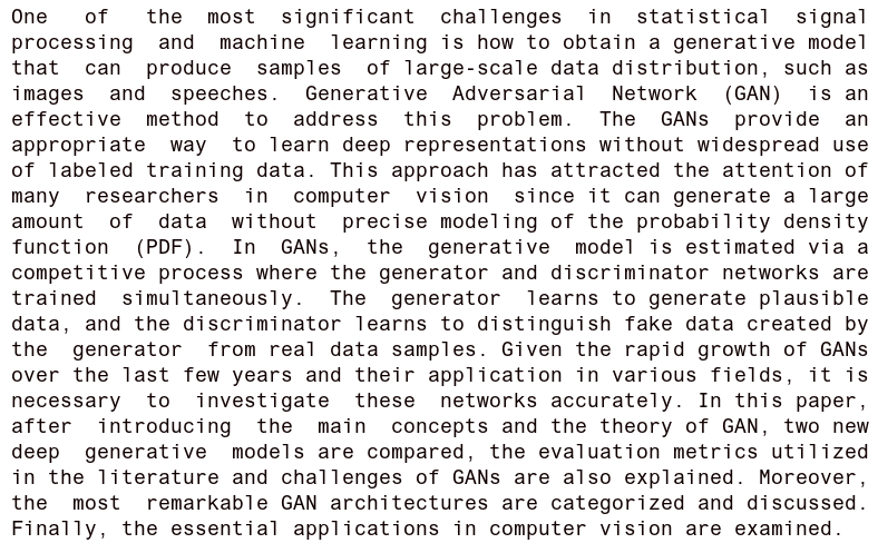 - 统计信号处理和机器学习中最重要的挑战之一是如何获得一个生成模型,它可以生成大规模数据分布的样本,例如图像和语音。生成对抗网络(GAN)是解决这一问题的有效方法。GANs提供了一种适当的方法来学习深层表示,而不需要使用大量的标记训练数据。该方法无需对概率密度函数(PDF)进行精确建模就能生成大量数据,引起了计算机视觉领域众多研究者的关注。在GANs中,生成模型是通过同时训练生成器和鉴别器网络的竞争过程来估计的。生成器学习生成可信的数据,鉴别器学习将生成器生成的虚假数据与真实数据样本区分开来。鉴于近年来GANs的快速发展及其在各个领域的应用,有必要对这些网络进行准确的研究。[29]在介绍GAN的主要概念和理论的基础上,对两种新的深层生成模型进行了比较,并对文献中使用的评价指标和GANs面临的挑战进行了说明。
