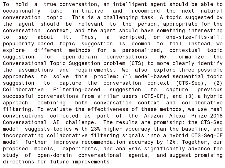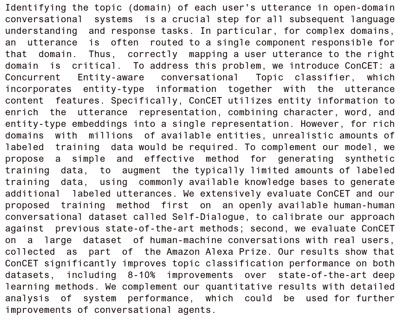 - 在开放域对话系统中,确定每个用户话语的主题(域)是所有后续语言理解和响应任务的关键步骤。特别是对于复杂的域,话语通常会寻路到负责该域的单个组件。因此,正确将用户话语映射到正确域至关重要。为解决此问题,[10]介绍ConCET:并发实体感知会话主题分类器,其将实体类型信息与话语内容功能结合在一起。具体而言,ConCET利用实体信息来丰富发声表示,将字符、单词和实体类型的嵌入组合为单个表示。但是,对于具有数百万个可用实体的丰富域,将需要海量的带标签训练数据。为补充所提模型,研究者又提出一种简单有效的方法来生成综合训练数据,以使用通常可用的知识库生成其他标记话语来增加通常有限数量的标记训练数据。首先,研究者在一个公开的人与人对话数据集Self-Dialogue上广泛评估ConCET和所提训练方法,以将所提方法与当前最佳方法进行校准;其次,研究者在与真实用户的大型人机对话数据集上评估了ConCET,该数据集是Amazon Alexa Prize的一部分。实验结果表明,ConCET在这两个数据集上,与最新深度学习方法相比,显著提高了主题分类性能约8-10%。研究者通过对系统性能的详细分析来补充定量结果,该分析可用于进一步改进会话代理。