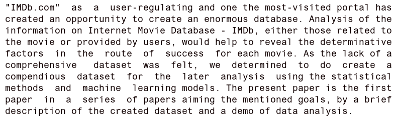 - IMDb.com是依靠用户规范维持的电影评分门户网站,也是访问量最大的门户之一,这为创建巨大的数据库提供了机会。分析与电影有关或由用户提供的互联网电影数据库IMDb上的信息,将有助于揭示每部电影成功途径的决定性因素。基于此,[21]使用统计方法和机器学习模型为以后的分析创建了一个大规模数据集,这是针对前述目标的一系列论文中的第一篇,其中简要介绍了创建的数据集和数据分析演示。
