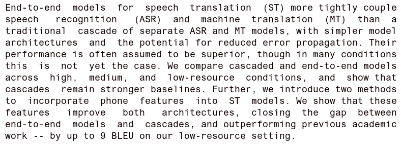 - 语音识别(ASR)和机器翻译(MT)的端到端模型,相比于传统的单独的ASR和MT的级联模型,结合的更加紧密,具有更简单的模型体系结构和减少错误传播的潜力。他们的表现往往被认为是优越的,虽然在许多情况下还不是这样。[8]比较了高、中、低资源条件下的级联和端到端模型,并表明级联模型仍然是更强的基线。此外,文章还介绍了两种将手机特征纳入ST模型的方法。文章展示了这些特性改进了这两个架构,缩小了端到端模型和级联模型之间的差距,并且比以前的学术工作表现更好。