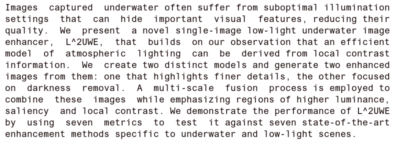 L^2UWE: A Framework for the Efficient Enhancement of Low-Light Underwater Images Using Local Contrast and Multi-Scale Fusion