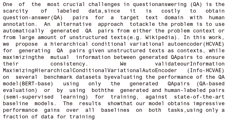 - 问答(QA)中最关键的挑战之一是标记数据的稀缺性,因为获取带有人工标注的目标文本域的QA对非常昂贵。解决问题的一种方法是使用从问题上下文或大量非结构化文本(如Wikipedia)中自动生成的QA对。[7]提出一种分层条件变分自编码器(Hierarchical Conditional Variational Autoencoder,HCVAE),用于在给定非结构化文本作为上下文的情况下生成QA对,同时最大化生成QA对之间的互信息以确保它们的一致性。通过仅使用生成的QA对(基于QA评估)或通过使用生成的和人为标记的对(半监督学习)评估QA模型(基于BERT的性能),研究者在几个基准数据集上验证了所提的信息最大化层级变分自编码器(Info-HCVAE)。结果表明,即使仅使用部分数据训练,该模型仍在两项任务的所有基线上均获得令人印象深刻的性能提升。