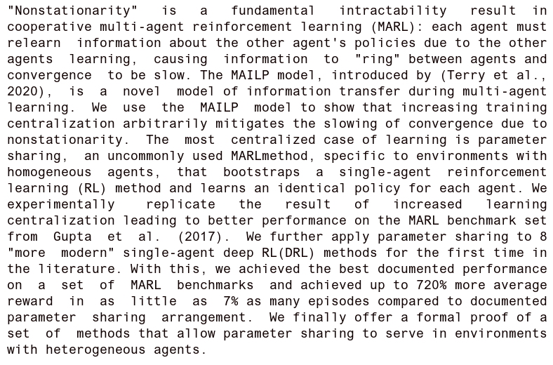 - “非平稳性”是协作多智能体强化学习(MARL)中一个基本的棘手问题:由于其他智能体在学习,每个智能体必须重新学习关于其他智能体策略的信息,导致信息在智能体之间形成了“环”,因此收敛速度变慢。MAILP模型(Terry et al., 2020)是一种新的多agent学习过程中的信息传递模型。[33]使用MAILP模型来表明,增加训练的集中化可以缓解由于非平稳性而导致的收敛速度减慢。最集中化的学习策略是参数共享,这是一种不常用的MARL方法,专门用于具有同构代理的环境。文章在Gupta等人(2017)的MARL基准集上实验复制了增加学习集中化导致更好性能的结果。文章在文献中首次将参数共享进一步应用于8种“更现代”的单代理深度强化学习方法。基于此,文章在一组MARL基准上获得了最好的记录性能,并且与现有的参数共享方法相比,文章提出的方法在少至7%的时间内获得了高达720%的平均回报。