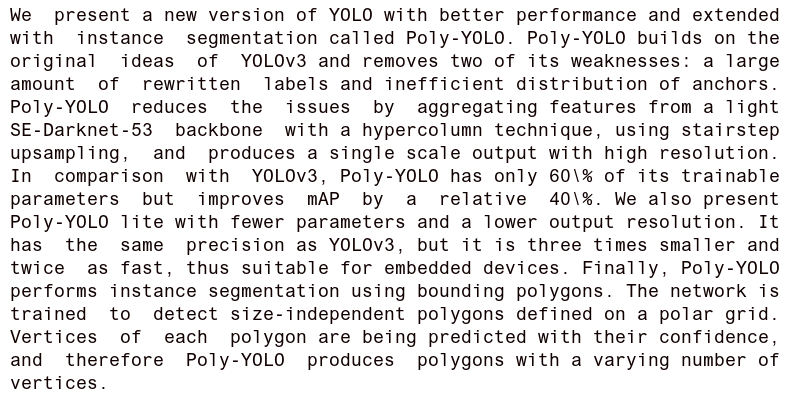 - [1]提出了一个新的YOLO,它具有更好的性能,并扩展了实例分割,称为Poly-YOLO。Poly-YOLO以YOLOv3的原始思想为基础,消除了它的两个缺点:大量重写的标签和低效的锚分布。Poly-YOLO使用超柱(Hypercolumn)技术将轻量级SE-Darknet-53主干的特征进行聚合,使用阶梯向上采样,从而减少问题的出现,并生成具有高分辨率的单尺寸输出。与YOLOv3相比,Poly-YOLO只有60%的可训练参数,但是相对提高了40%的mAP。文章还提供了参数更少、输出分辨率更低的Poly-YOLO lite。它具有与YOLOv3相同的精度,但比YOLOv3小三倍,快两倍,因此适合于嵌入式设备。最后,Poly-YOLO使用包围多边形来执行实例分割。该网络在经过训练后,可以检测在极性网格上定义的与大小无关的多边形。每个多边形的顶点都有各自的置信度,因此Poly-YOLO生成具有不同数量顶点的多边形。