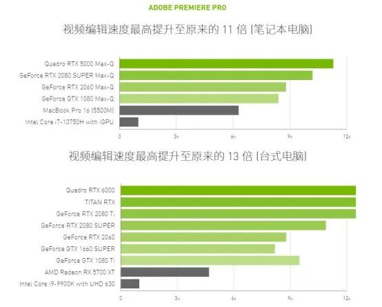 同时,在Adobe Premiere Pro 2020更新到14.2版本(及以后)后,加入了对NVIDIA GPU硬件编码器的支持,有助于缩短 H.264 或 H.265 / HEVC 内容的导出时间。根据NVIDIA的官方数据,采用硬件编码可以成倍的缩短导出时间,更好的专注于创作。
