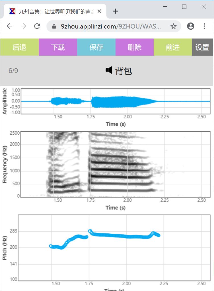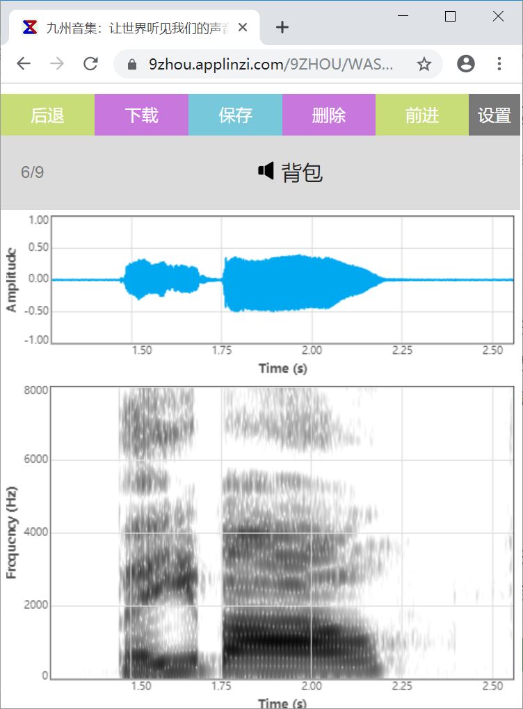在语图展示页面上,我们基于 WASP 代码在手机等移动设备上实现了语音数据的截取保存功能。用户可通过双指缩放波形图,单指左右移动波形图,把无效的语音数据排除在手机屏幕的可见范围之外,然后点击“保存”按钮,即可截取屏幕中可见的语音片段,并将其保存至“九州音集”的数据服务器中,覆盖原有的声音文件。