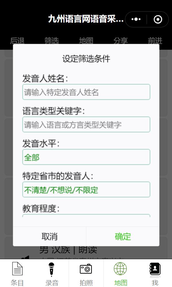 用户可以在目录页面上选定一个发音条目,然后切换至地图页面查看该条目相关的语音内容,还可以根据需要设定一定的条件对语音条目进行筛选,如设定发音人姓名、发音人的地理位置、语言类型或属性关键字、发音水平等筛选条件。系统可根据发音人的地理位置信息在地图上对语音条目进行展示,点击相关条目可以播放语音。