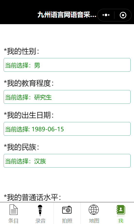 发音人可以在“我”页面登记用户信息,用户信息一旦提交后,就不可随意修改了,除非删除用户的全部数据(包含已经录制好的语音材料)之后再次重新注册登记。