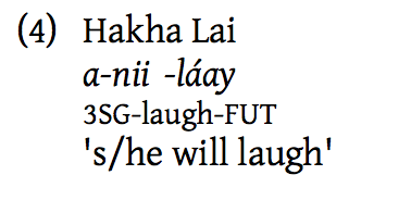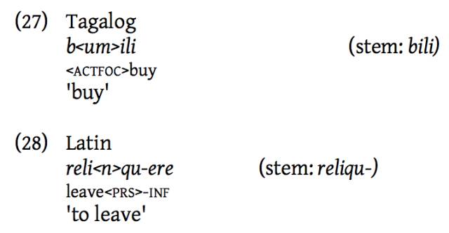 中缀一般会被定义为“左倾(left peripheral)”(如27)或“右倾(right peripheral)”,并且这决定了标注的位置,对应着中缀对词干标注中的意义。即使中缀没有明显倾向,也需要找到一个标准。