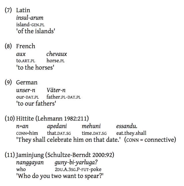 语法语素经常由缩写的语法行间标注表示,通常使用小体大写字母(small capital)。文末附有标准缩写表。