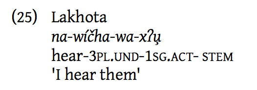 由两部分组成的语法或词汇元素被看作不同的语素体,比如Lakhota语中的双向词干’听’。有两种不同表达方式: