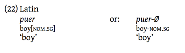 如果逐个语素标注中有一个在例句中没有表现出的成分,可以使用一个封闭的圆形支架符号来表示。在目标语言文本中加入“Ø”这个符号,然后前面加上连字符。例如: