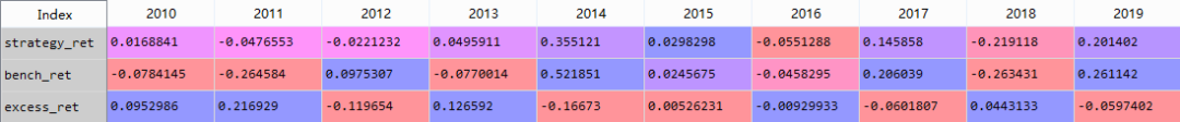 对策略时间段进行分割,统计每个时间段内上述指标的变化情况,本文按年进行分割,统计测年逐年的收益率和相对于基准的超额收益率。