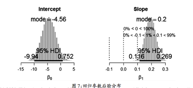 截距项和斜率参数后验分布如图7所示。图7左图为截距项后验分布,最有代表性的截距项估计为-4.56,但是95%高密度区间(-9.94-0.75)较大,且包括零值,说明截距项在回归中可能没有作用。右图为斜率后验分布,最有代表性的斜率估计值为0.2, 95%高密度区间不包括零值,有95%的斜率估计值介于0.12-0.27之间,说明英语水平对作文词汇复杂度有可信的预测力。我们设定的斜率实际对等域为±0.1。斜率估计95%高密度区间位于实际对等域之外,因而拒绝零假设之值(β1=0),表明英语水平对作文词汇复杂度有实际意义上的预测力。