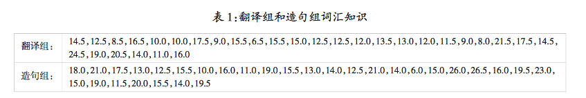 本节以两个独立组(观测值为连续性变量值)比较为例简要介绍贝叶斯推理方法。笔者将60名被试随机分配到包括14个目标词(生词)的英语短文阅读附带词汇学习任务中。生词音标、词类和释义在阅读短文中给出。一个任务组为翻译组(translation group),在阅读短文后,完成句子英译汉任务。这些句子为短文中出现的、包括目标词的原句。另一个任务组为造句组(sentence writing group),在阅读同一篇短文后,仿照短文中出现的、包括目标词的原句用目标词造句。两组在同样时间内完成各自的任务后,接受生词知识(包括拼写辨认和汉语释义)即时测试,卷面满分为28分。测试结果如表1所示。