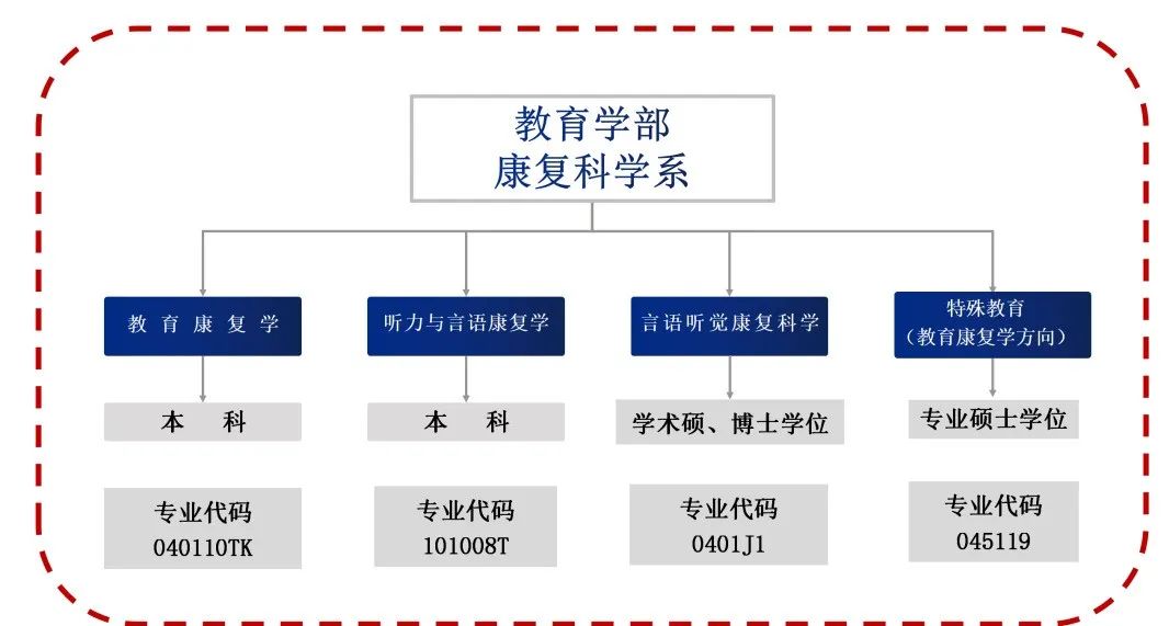 2004 年,在黄昭鸣教授、杜晓新教授、孙喜斌教授等的倡导和努力下,华东师范大学成功申报了中国大陆首个言语听觉科学本科专业。2020年,华东师范大学获批首个医学技术类专业——听力与言语康复学专业。这一新建专业与教育康复学专业一起开展康复类学科建设与人才培养。为此,经学校研究决定,华东师范大学教育康复学系更名为华东师范大学康复科学系,该系将进行听力与言语康复学(专业代码:101008T)、教育康复学(专业代码:040110TK)两个本科专业人才的培养,言语听觉康复科学硕博(专业代码:0401J1)人才的培养,以及专业硕士特殊教育(教育康复)人才的培养(专业代码:045119)。