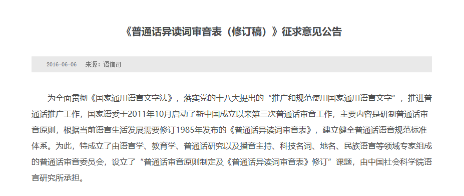 2016年新版《普通话异读词审音表(修订稿)》曾面向社会公开征求意见,但是到现在还一直没有正式发布