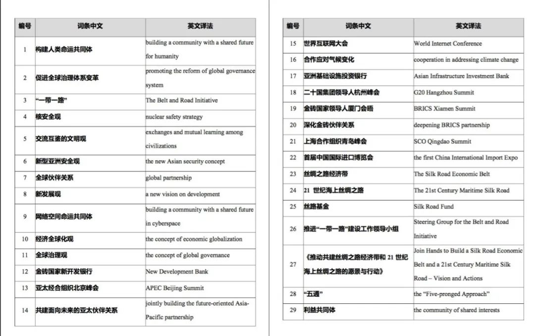 为加强中国时政术语对外译介的标准化和规范化,助力提升国家翻译能力建设的精准性和实效性,当代中国与世界研究院、中国翻译研究院汇总梳理2012-2018年中国时政术语,结合对外话语创新工作需要,按照“五位一体”总体布局的谋划部署,从政治、经济、文化、社会、生态文明、外交、全球化等七个方面分类遴选450余条汉英对照关键词汇,经中国翻译协会国家重大翻译项目审定工作委员会和中国翻译研究院重点翻译任务统筹工作机制研商审定,现对外发布,供业界及相关人员参考使用。