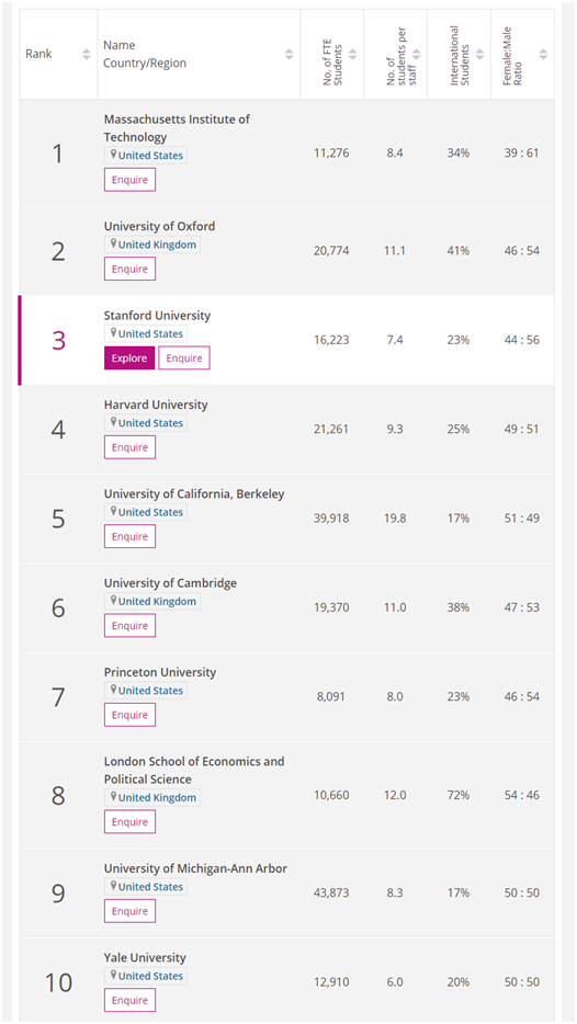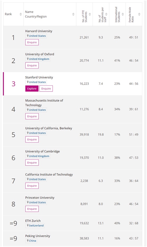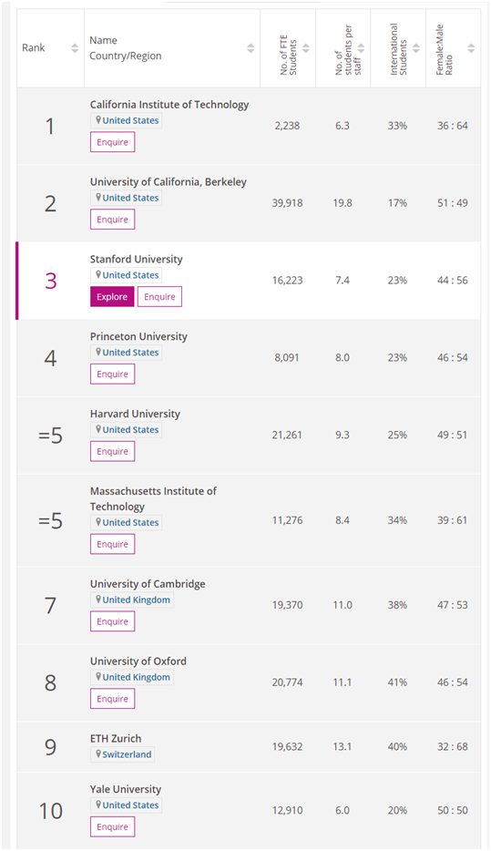 英美院校包揽了前10名,其中斯坦福大学占据首位。同时,瑞士苏黎世ETH大学是英美外排名最高的大学,位列第12位。新加坡国立大学排在亚洲首位。