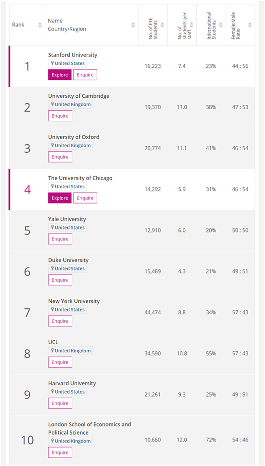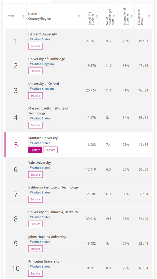 牛津大学霸占榜首位置多年,另外哈佛、剑桥、帝国理工、斯坦福大学常年排在前5名。