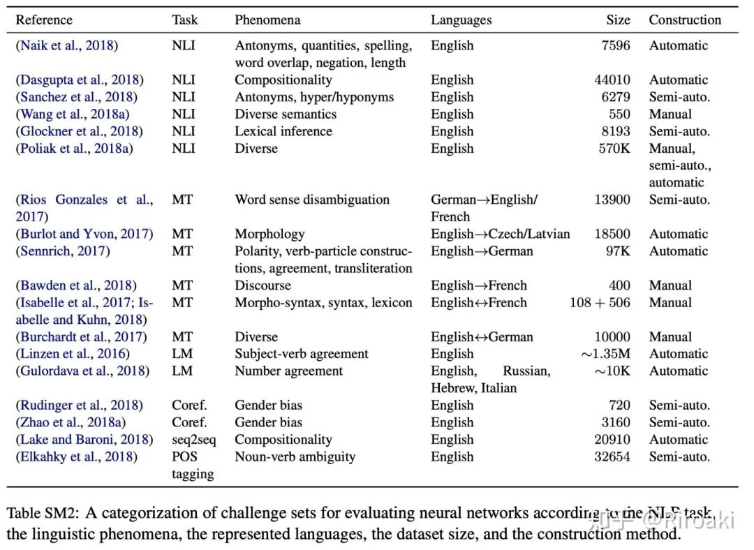 挑战集的主要目标之一是评估模型处理特定语言现象的能力。早期的研究强调穷举性(Cooper等,1996;Lehmann等,1996),而最近的研究则倾向于关注一些感兴趣的特性:例如,Sennrich(2017)为MT评估引入了一个挑战集,该挑战集着重于5个属性:主语一致,名词短语一致,动词结构,极性和音译。对形态学的MT挑战集略为详细阐述,包括14种形态学特征(Burlot和Yvon,2017年)。其他挑战集涵盖了更多种语言属性:例如,在Cooper等人中扩展类别(1996年),针对NLI的GLUE分析集涵盖了四个粗略类别(词汇语义,谓语-自变量结构,逻辑和知识)中的30多种现象。在MT评估中,Burchardt等人(2017)使用覆盖120种现象的大型测试套件报告了结果,部分基于Lehmann等(1996),Isabelle等(2017)和Isabelle and Kuhn(2018)为MT评估准备了挑战集,涵盖了词素句法,句法和词法层面的细粒度现象。通常,以编程方式构建的数据集倾向于涵盖较少的细粒度语言属性,而手动构建的数据集则表示更多种现象。