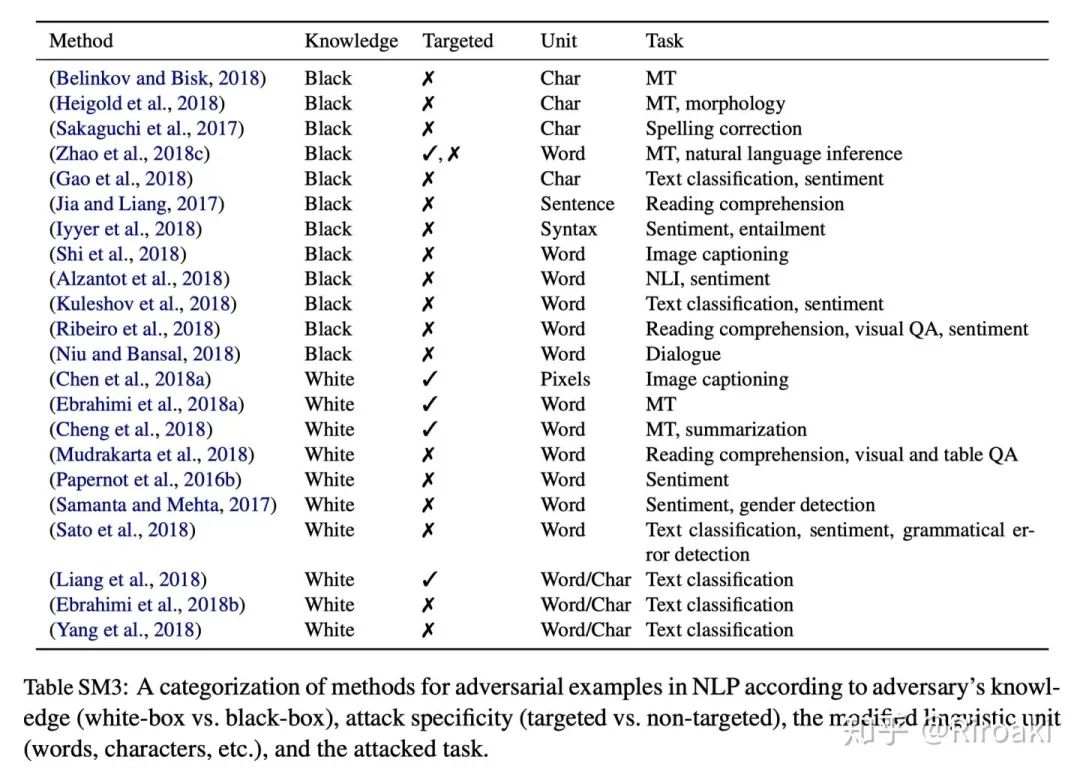 在对抗图像样本中,通过测量像素空间中的距离来测量扰动是相当简单的,可以使用某些正则化方法,或采用与人类感知更好相关的替代措施(Rozsa等,2016)。呈现对抗图像与源图像之间没有明显差异的视觉效果也令人信服。而在文本域中,距离的测量不是那么简单,人类甚至可以感觉到文本的很小变化。因此,对攻击的评估相当棘手。一些研究对对抗样本施加了限制,使其具有少量的编辑操作(Gao等人,2018)。其他人则以不同的方式确保句法或语义上的连贯性,例如通过单词相似性或句子相似性过滤替换(Alzantot等人,2018;Kuleshov等人,2018),或使用同义词和其他单词表(Samanta和Mehta,2017;Yang等,2018)。一些人报告了人类是否可以正确地将对抗性示例分类(Yang等人,2018),但这并未表明变化的可感知性。更多信息丰富的人研究评估了对抗性示例与原始示例的语法相似性或相似性(Zhao等人,2018c;Alzantot等人,2018)。考虑到在文本中产生难以察觉的变化的固有困难,需要更多这样的评估。