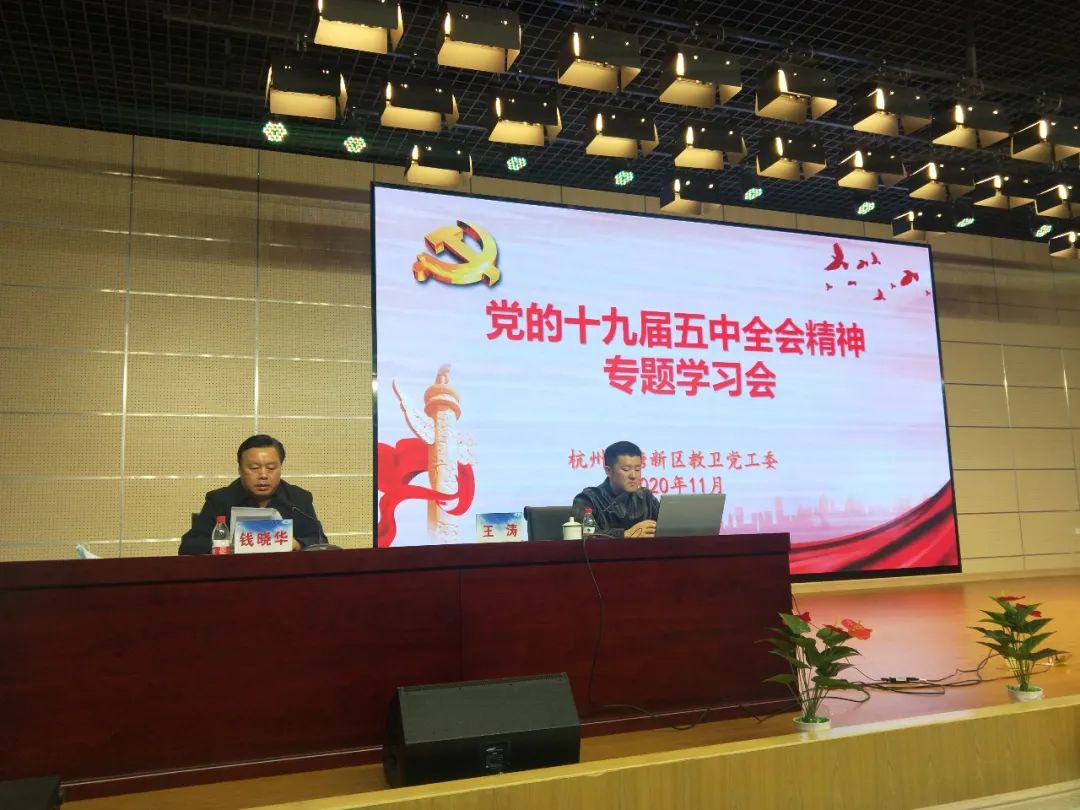 11月26日,钱塘新区教卫系统党的十九届五中全会精神专题学习会在新围中学举行,教卫党工委书记、局长钱晓华主持并讲话,教卫党工委各委员、局领导出席,教卫局党总支全体党员,直属单位负责人,教卫系统各基层党组织书记、副书记,各校(园)长、社卫中心主任和中小学思政课教师等210多人参加。