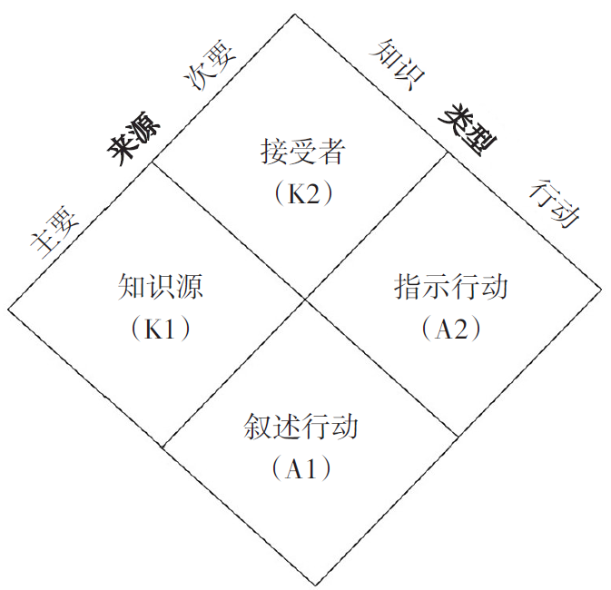 会话协商涉及知识和行动两种类型,以及主要和次要两种来源,其相互组合产生出的4个主要分析指标(编码)如图3所示。知识源(K1)指学习者在协作过程中把自己定位为知识的来源,包括学习者在讨论中主动就问题进行回复,如“是”或“不是”;以及主动地贡献知识,发表自己的观点,如对事实的陈述、解释和举例等。接受者(K2)指当学习者对学习内容提出疑问而引发他人意见和观点,或提出新的观点并询问他人意见时,将自己作为知识的接受者。叙述行动(A1)指学习者叙述客观的事实,如对小组达成学习任务的情况进行描述。指示行动(A2)指学习者对他人在学习中遇到的困难给出解决办法,为其指引解决问题的方向,如指导组内合作的进程。此外,挑战行动(CH)指学习者会话表现出矛盾和冲突,即与之前的内容、断言相反或者不相关。其他行动(O)指与主题无关的动作,不属于以上行为的都归类为其他行动。在会话协商的各个分析指标中,知识源、指示行动和挑战行动反映出学习者的主导地位,称为主导源;接受者和叙述行动反映出学习者的跟随地位,为非主导源。
