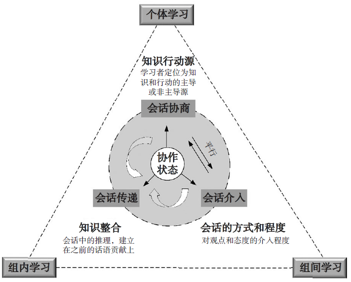 在该模型中,会话协商和会话介入之间存在着平行关系,即当学习者开始把自己定位为知识和行动的主导源时,他们也认同讨论的话题存在着其他的可能性,愿意接受不同的声音和观点。当学习者的行为在会话协商和会话介入这两个维度之间转变时,学习者进行着知识的传递和整合,在之前自己或是他人的观点之上进行推理,从而促进协同认知的发展。