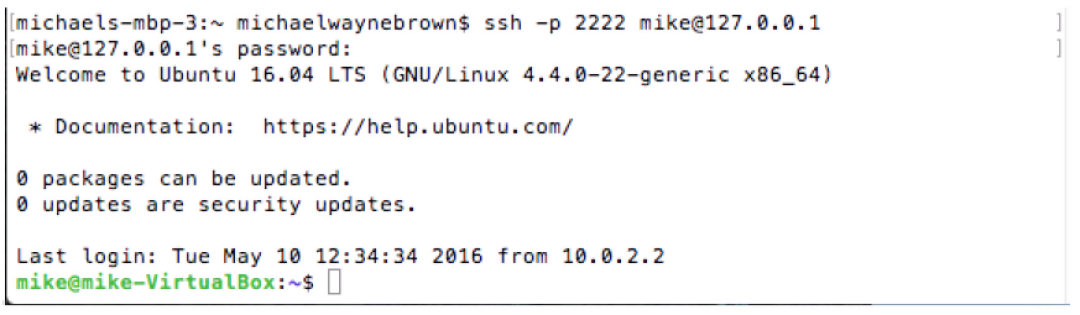 $ ssh mike@ubuntu (ubuntu = hostname) or 127.0.0.1 or 10.0.2.15 ...